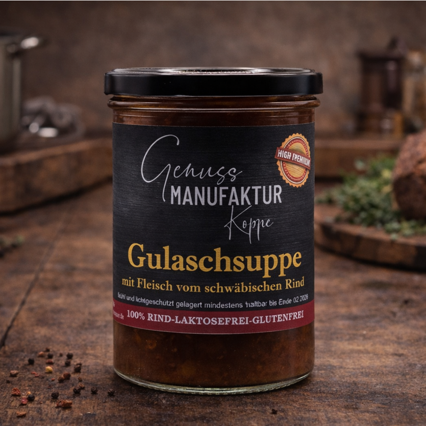 | Inhaltsstoffe | Paprika, KartoffelnRindfleisch vom schwäbischen Rind, Zwiebel, RotweinRotwein, Tomatenmark, Rapsöl, Knoblauch, Rindfleisch vom schwäbischen Rind |