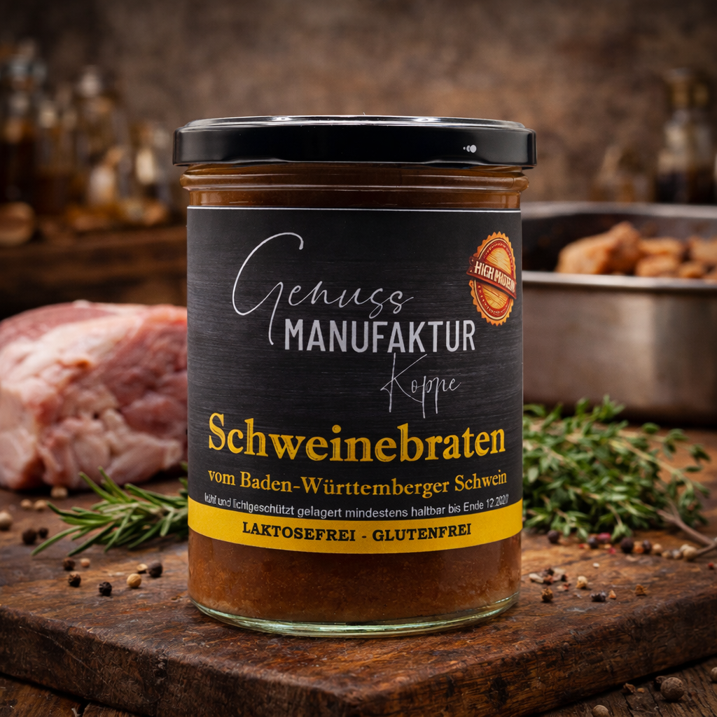 | Inhaltsstoffe | Schweinefleisch vom Baden-Württemberger Landschwein, KümmelRindersud, Schweinesud, Rotwein, Zwiebel, Tomatenmark, SELLERIE, Karotten, Worchestershiresauce (Branntweinessig, SENF, Gewürze), Rapsöl |